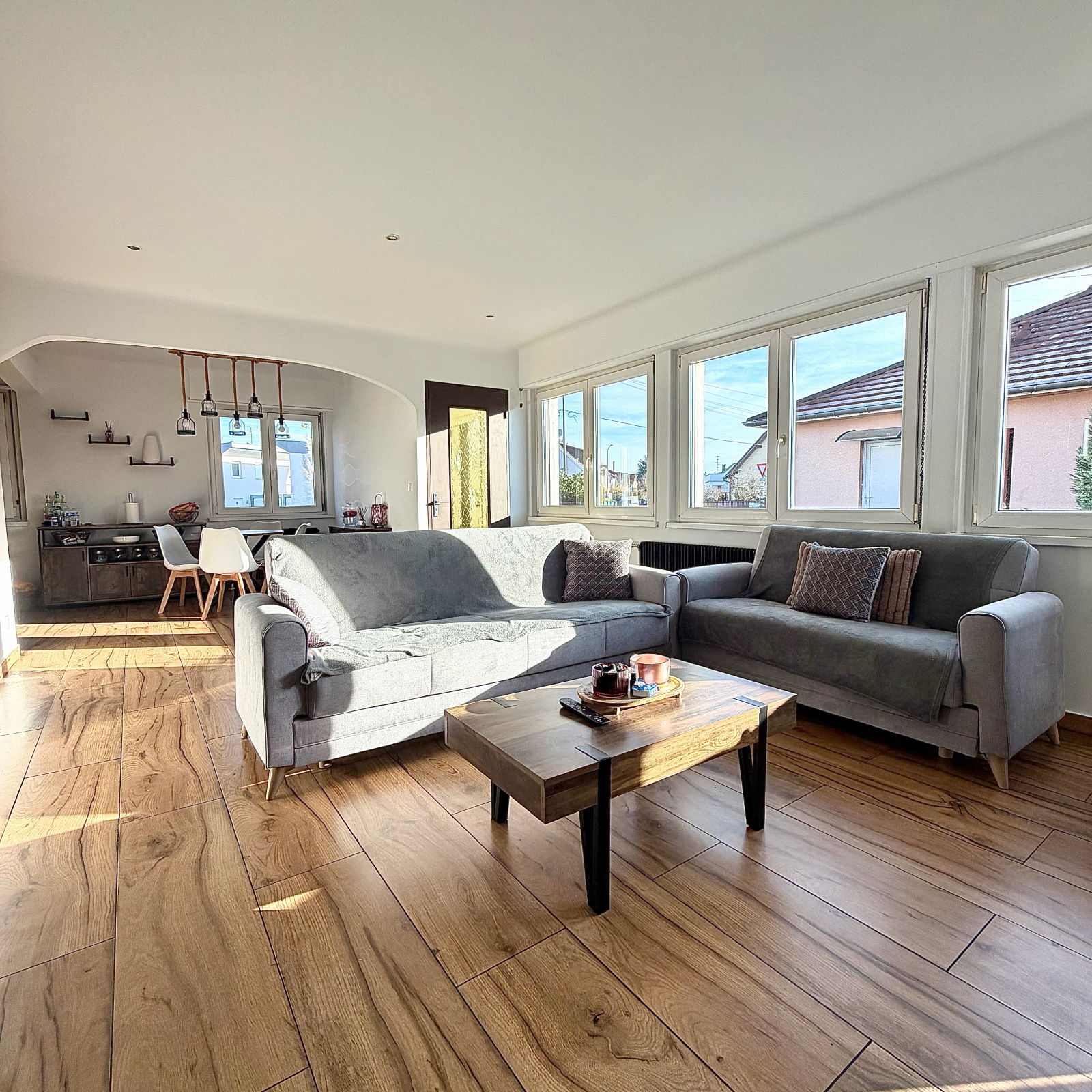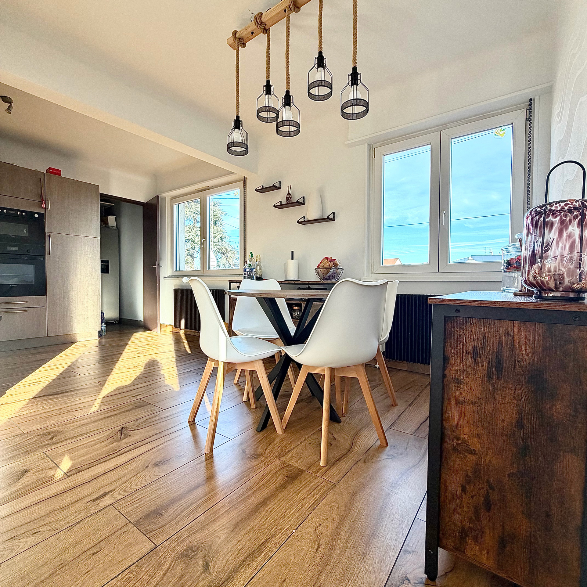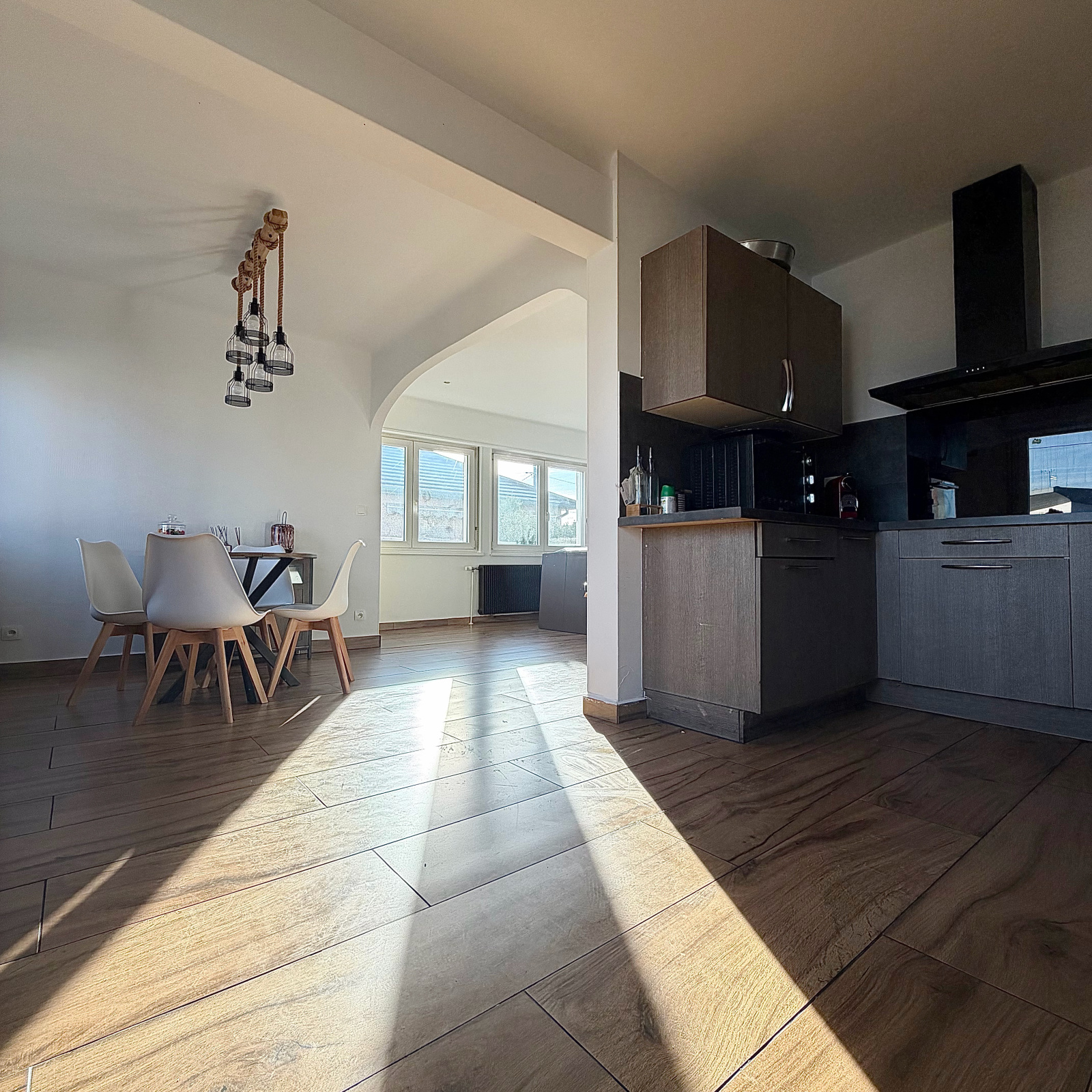 Celle-ci se compose d'une belle pièce de vie baignée de lumière et entièrement ouverte entre la cuisine et le salon séjour. Accès direct vers la terrasse depuis la partie séjour.