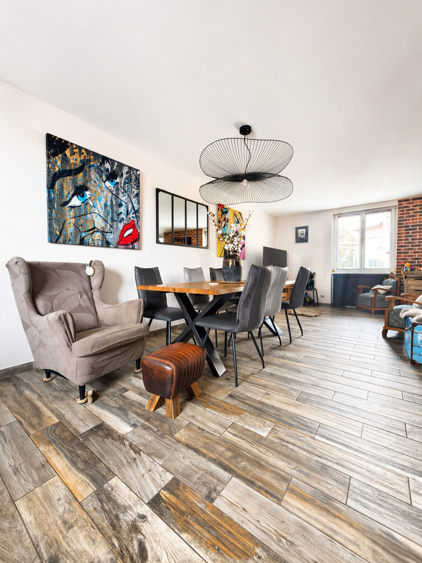 Venez découvrir cette charmante maison individuelle de 110 m², entièrement rénovée avec soin pour offrir un cadre de vie moderne et chaleureux. Le rez-de-chaussée s’ouvre sur une vaste cuisine équipée, parfaitement intégrée à une pièce de vie lumineuse, complétée par une salle d’eau et un WC séparé.