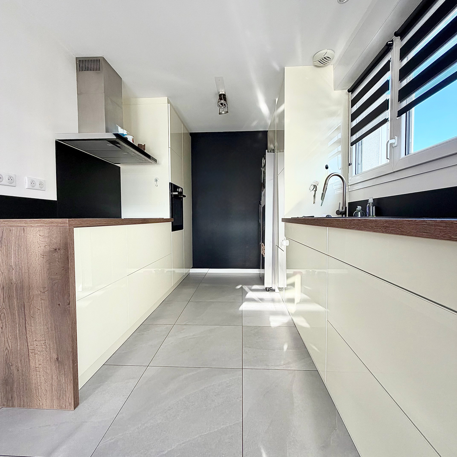 La cuisine Schmidt, entièrement équipée et dotée de nombreux rangements, s’ouvre harmonieusement sur l’espace de vie, créant un ensemble convivial et fonctionnel.