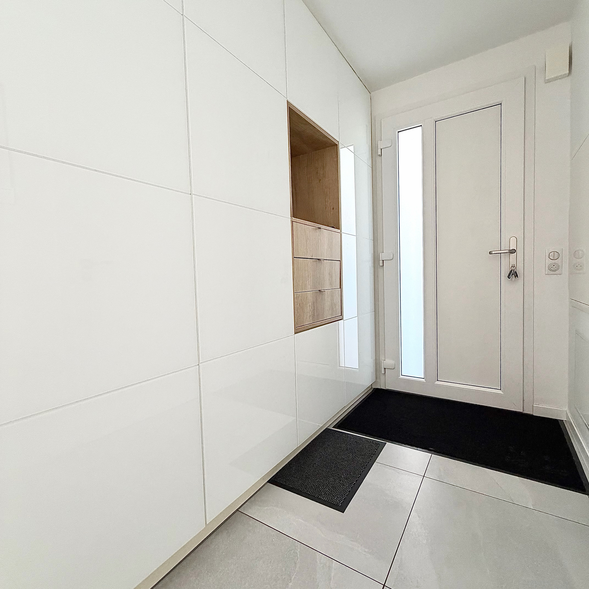 Dès l’entrée, vous découvrirez un hall avec placards de rangements Schmidt, menant à une belle pièce de vie lumineuse en open-space.