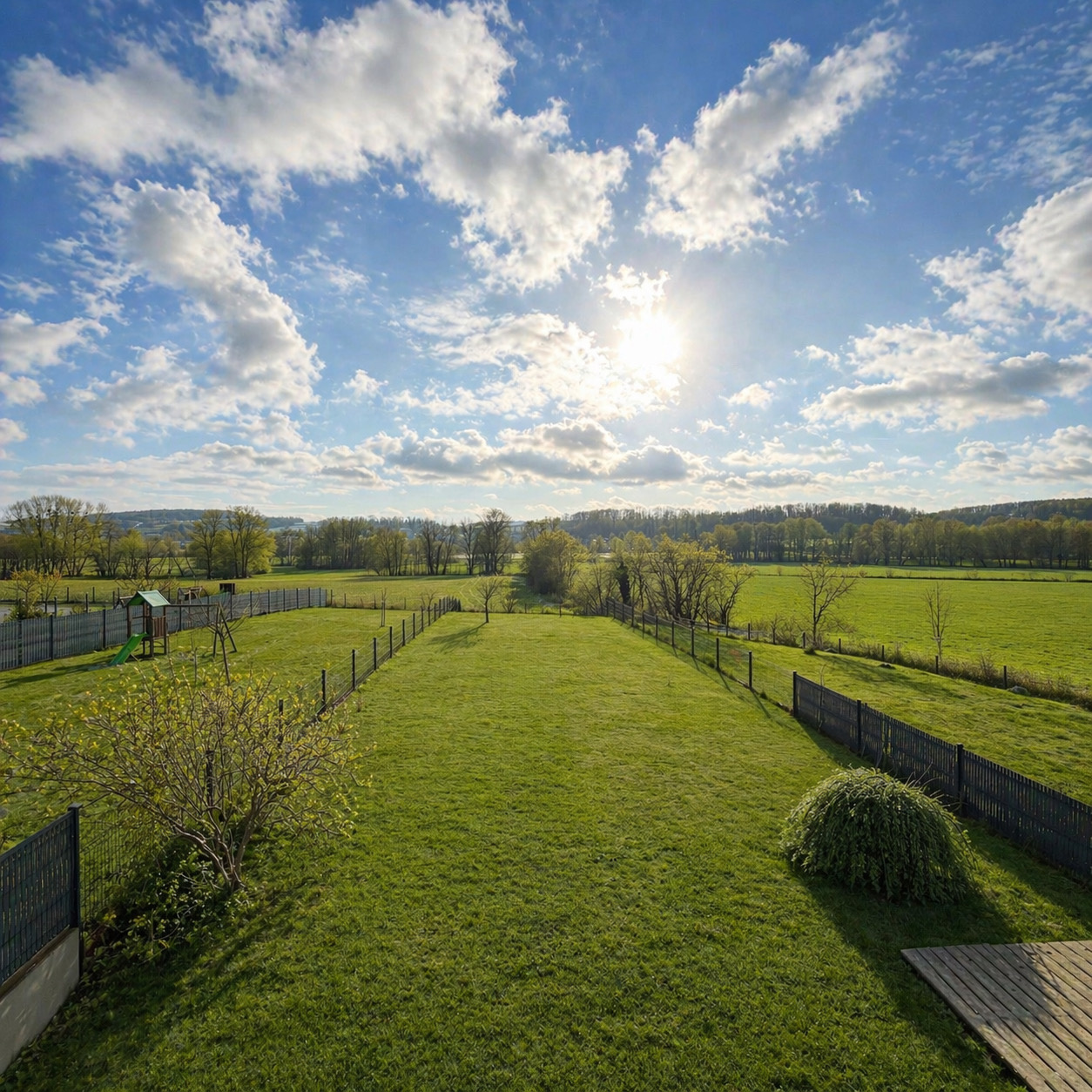 un magnifique terrain, une belle terrasse, sans aucun vis-à-vis, dans un cadre champêtre et paisible, idéal pour se ressourcer.