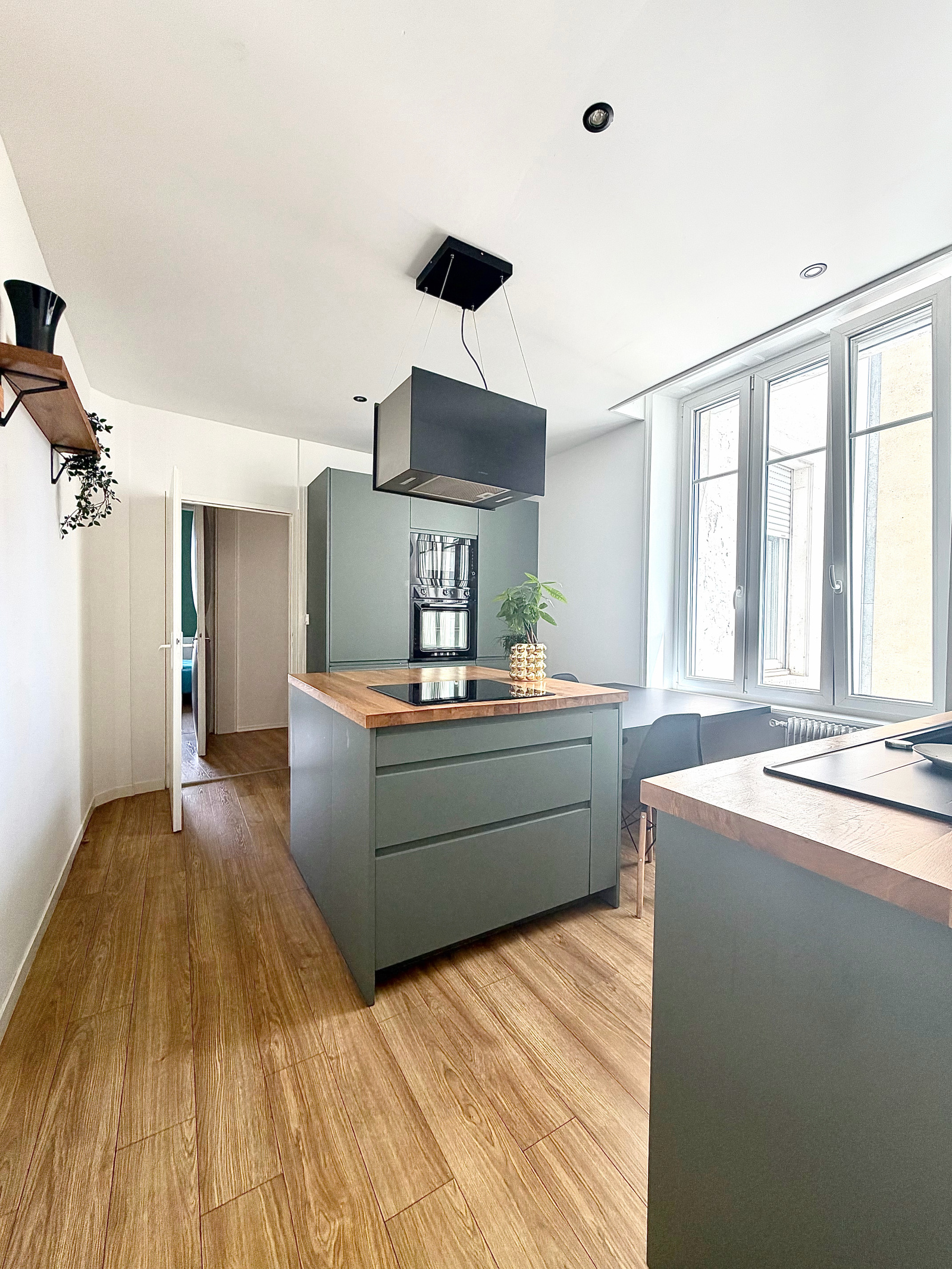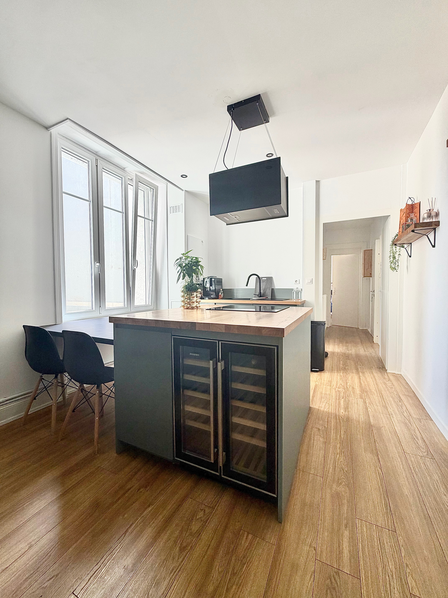 Au premier étage, ce bien s’ouvre sur une entrée accueillante desservant une superbe cuisine dinatoire, entièrement équipée et récemment rénovée, idéale pour partager des moments conviviaux.