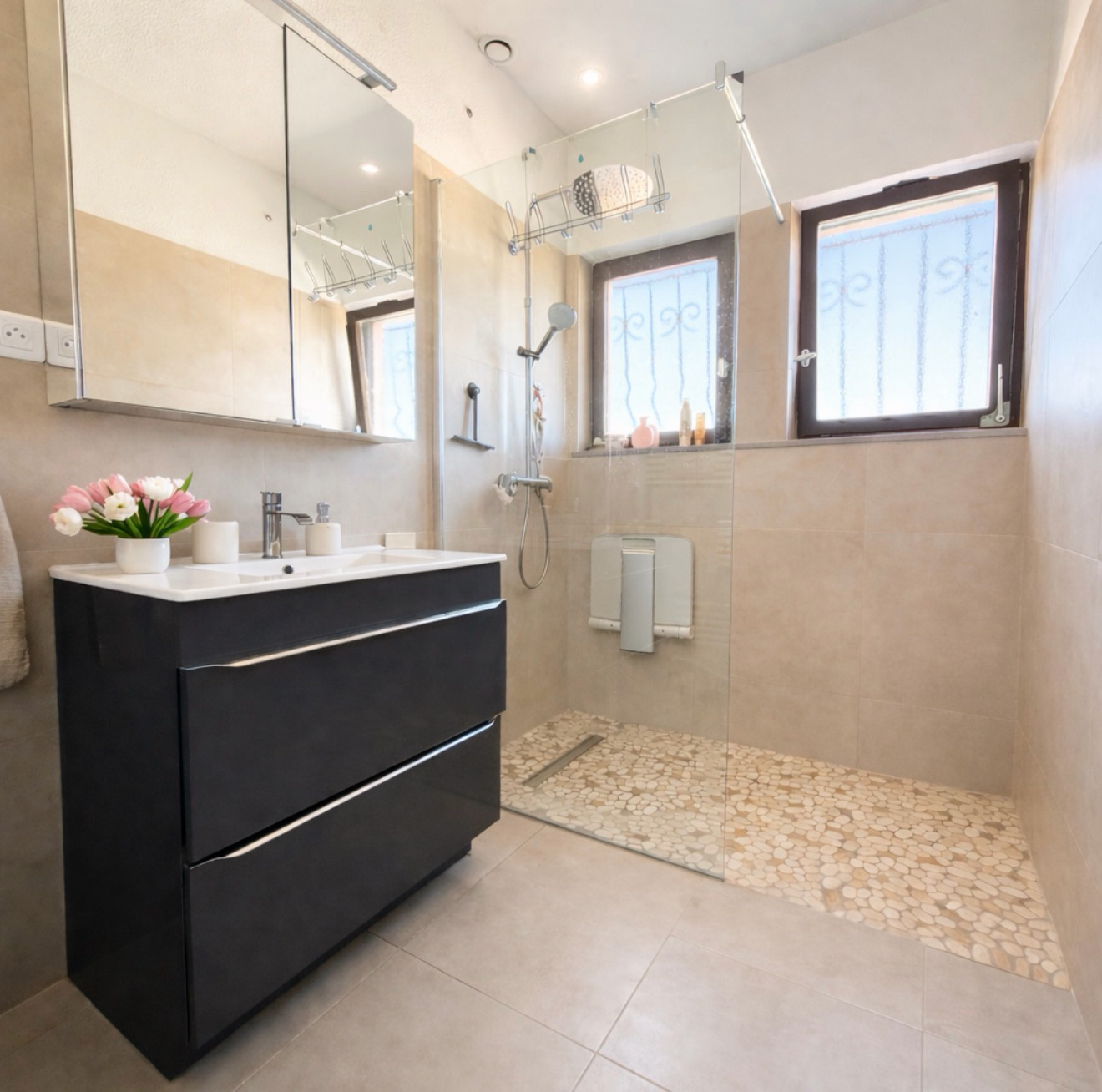 Le coin nuit propose deux chambres, une salle d’eau moderne ainsi qu’un WC séparé.